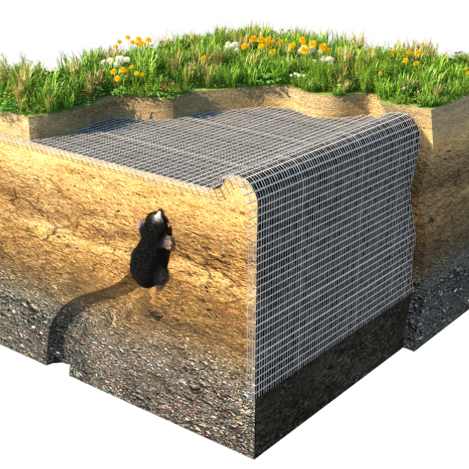 Maulwurfshügel sind oft ein unschöner Anblick und verursachen große Schäden an Rasenflächen. Um diese Maulwurfshügel auf tierfreundliche Weise zu bekämpfen, können RootBarrier® Maulwurfssperre horizontal und vertikal installiert werden. Die Maulwurfssperre wird horizontal bis zu 5 cm und vertikal 50 cm bis 1 m unter dem Rasen angebracht.