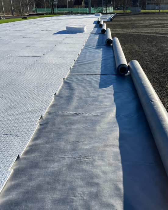 Waterondoorlaatbaar doek als onderlaag bij kunstgras sportvelden.
