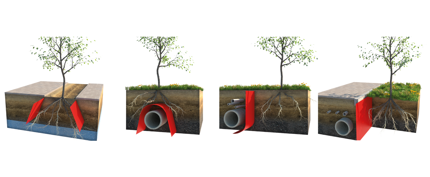 Een wortelweringsscherm kan niet te dicht rondom een boom geplaatst worden. Door het gladde materiaal blijven de wortels binnen deze cilinder rondgroeien, waardoor er een risico op het “bloempot effect” ontstaat. Hierdoor krijgt de boom te weinig houvast in de grond, zodat deze bij een storm kan omwaaien. Met een wortelgeleidingssysteem worden de wortels met behulp van verticale geleidingsribben naar beneden geleid en hiermee voorkom je dat er een “bloempot effect” kan ontstaan.